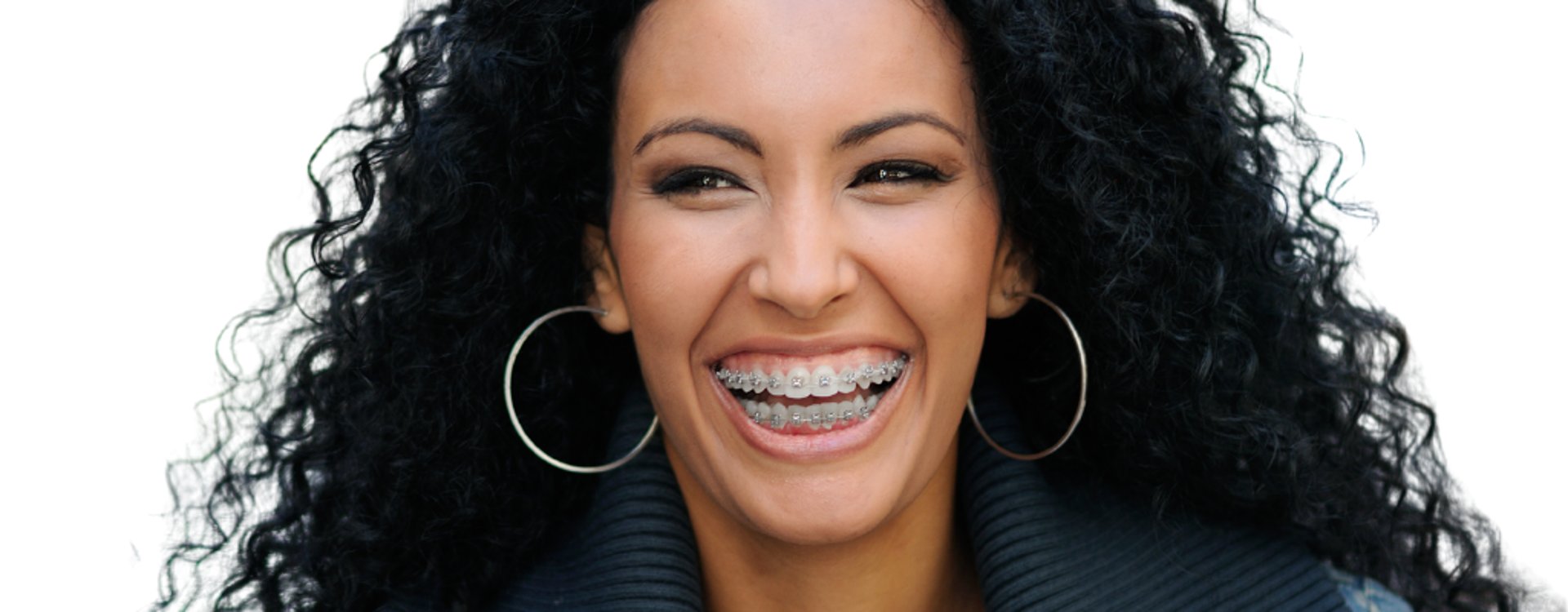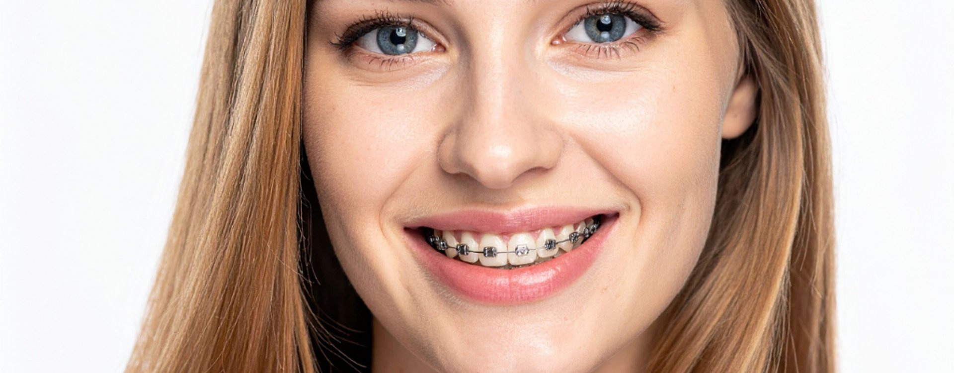 Sorriso alinhado com aparelhos modernos, fixos ou invisíveis.